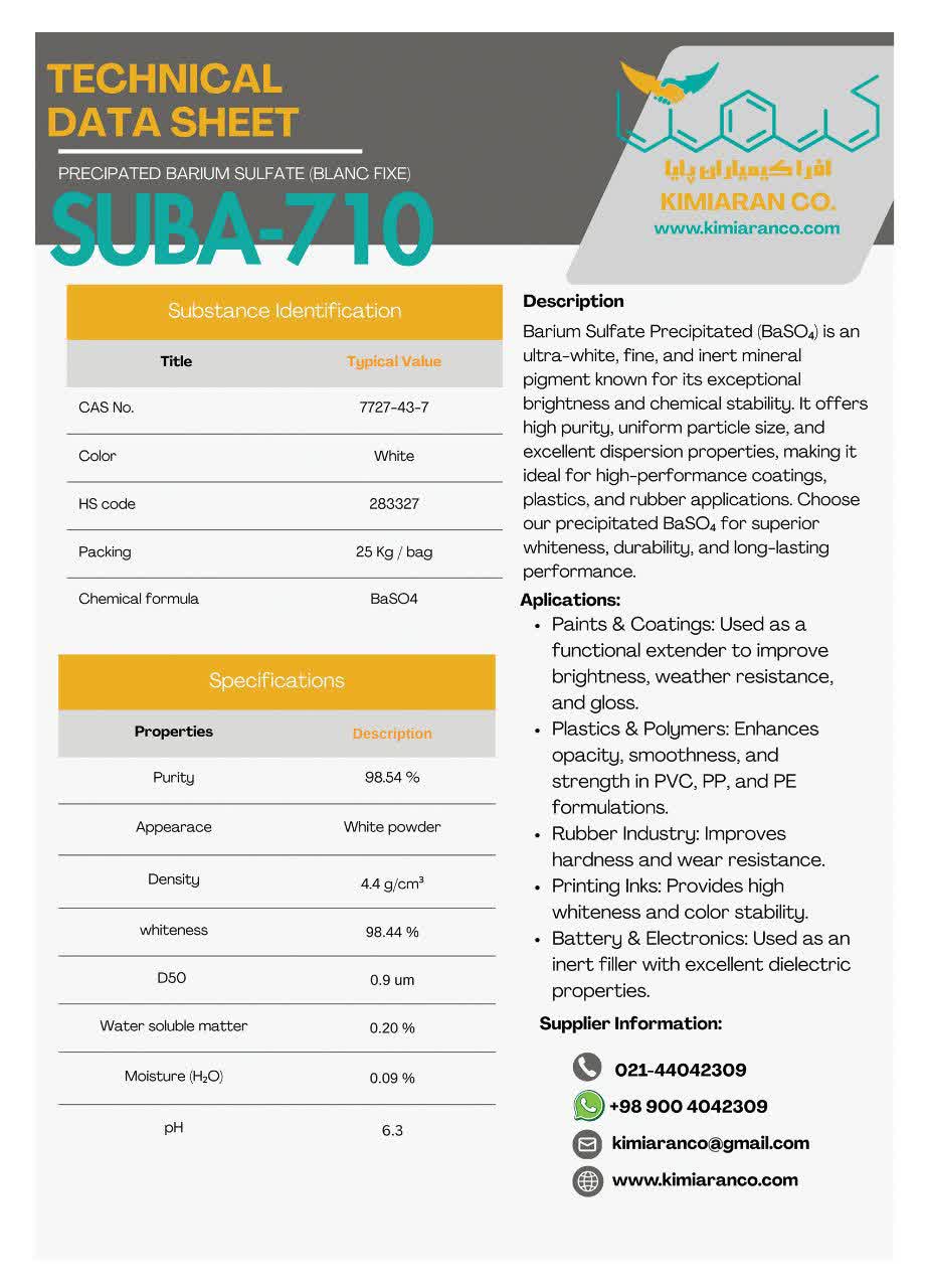 | BaSO₄ (Blanc Fix) | SUBA – 710 | خلوص بالای ۹۸٪ |